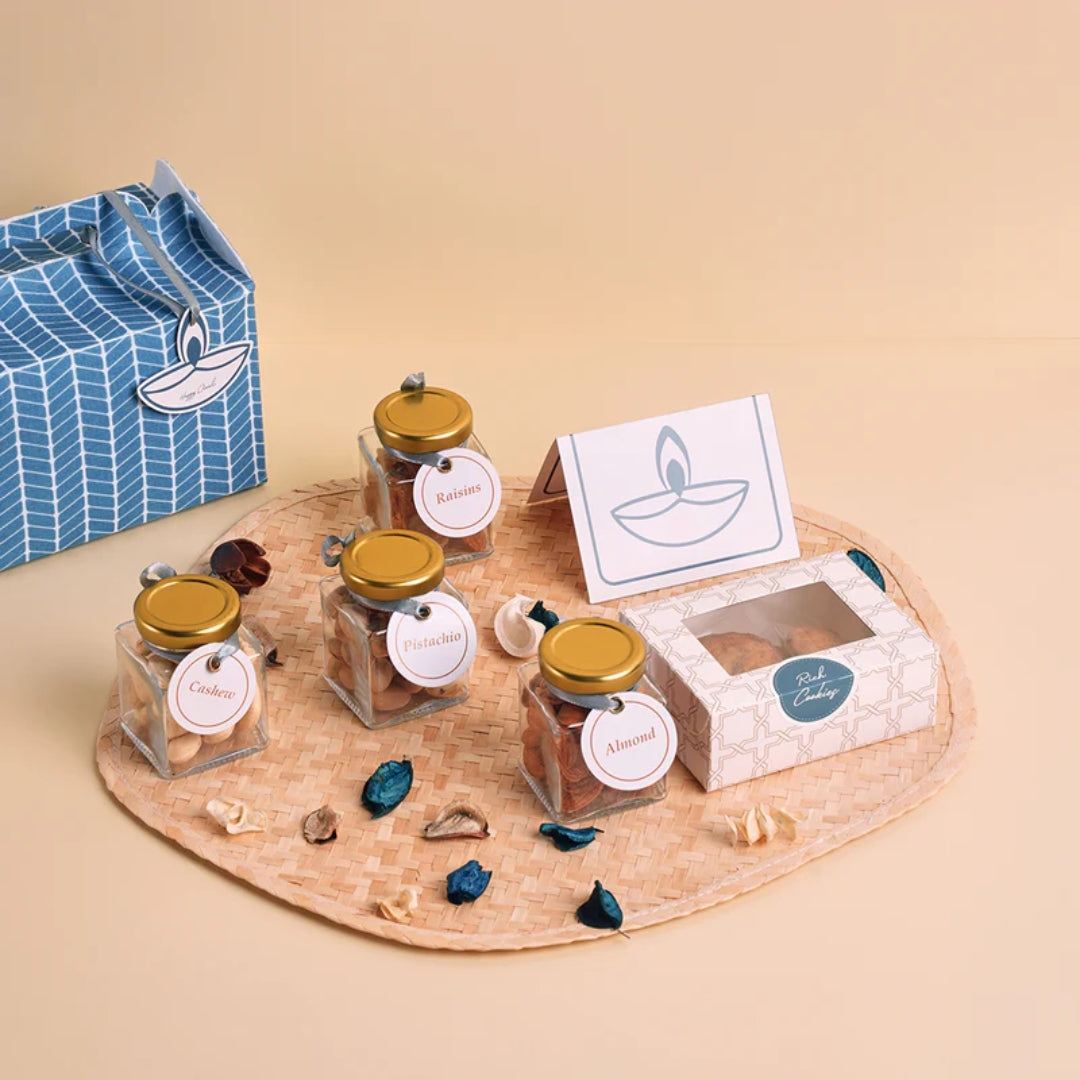 Add sweetness and joy to every occasion with The Celebration Box, a thoughtful hamper filled with delightful treats. Packed in a charming felt bag (6×4.5×4 inches), it includes a jar of pista (30 g), raisins (30 g), cashews (30 g), and almonds (30 g) for a healthy crunch. To balance tradition with indulgence, the box also offers 4 pieces of delicious cookies. A custom note card (6L x 4H inches) adds a personal touch, making it a perfect gift for festive celebrations.