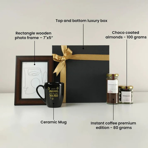 There can be nothing better than a loving reminder of happier memories captured in a frame, each time your loved one walks by the mantel with a cup of coffee. The couture and beautifully designed package is a simple yet soul soothing assortment of abstract goodies and delicious munchies perfect for any occasion.