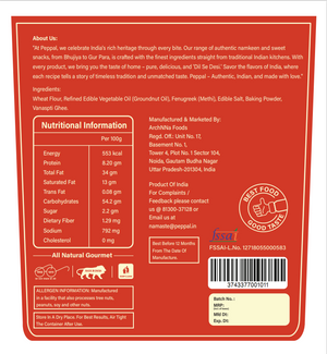 Wheat Flour, Refined Edible Vegetable Oil (Groundnut Oil), Fenugreek (Methi), Edible Salt, Baking Powder, Vanaspti Ghee.