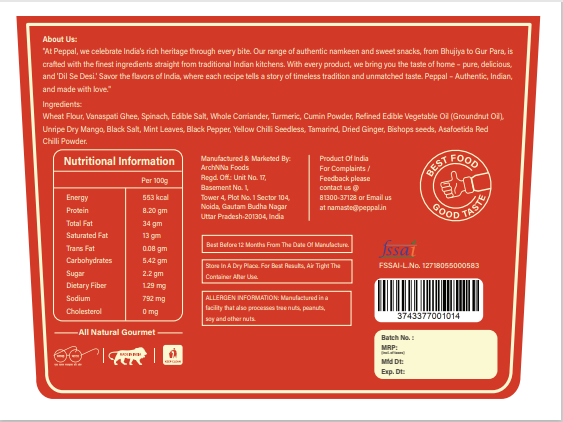 Wheat Flour, Vanaspati Ghee, Spinach, Edible Salt, Whole Corriander, Turmeric, Cumin Powder, Refined Edible Vegetable Oil (Groundnut Oil), Unripe Dry Mango, Black Salt, Mint Leaves, Black Pepper, Yellow Chilli Seedless, Tamarind, Dried Ginger, Bishops seeds, Asafoetida Red Chilli Powder.