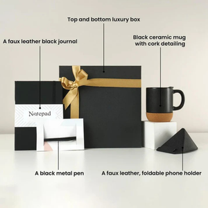 This hamper is made for your most sassy and sleek employees! The mood of the hamper screams focus, passion, and determination. The hamper is curated in a black box and gold detailing, with all the products inside following the same color theme. The hamper contains a sleek black journal and a metal pen for note taking, a classic ceramic black mug with cork detailing and a foldable, faux leather phone holder completes the hamper.